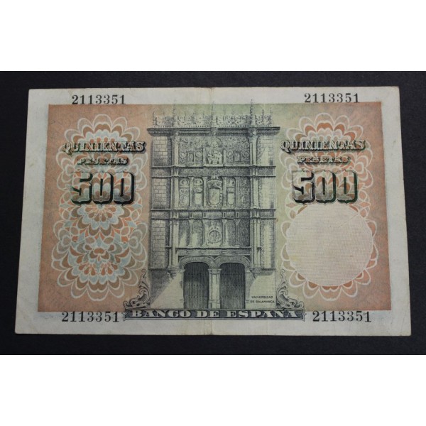 Billete del Banco de España , Estado español fecha 19 de febrero de 1946 Madrid de valor 500 pesetas Billete de Francisco de Vitoria. reverso Universidad de Salamanca. Banknote Sin Serie clasificacion PICK#132a. conservacion MBC +