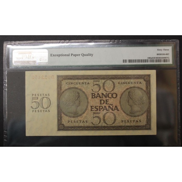 Billete del Banco de España , Estado español año 1936 Burgos de valor 50 pesetas serie D. Billete con mujeres en Reverso. Banknote PMG 63 - EPQ - Exceptional Paper Quality. Choice Uncirculated. clasificacion PICK#100a. conservacion Sin Circular.
