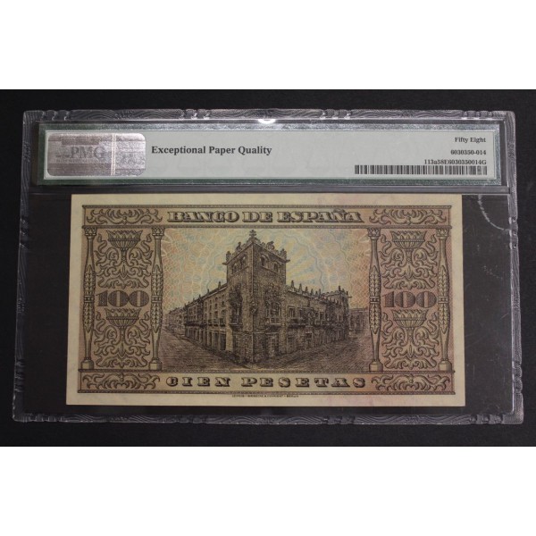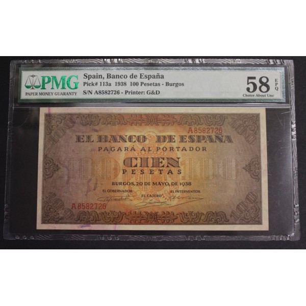 Billete del Banco de España fecha emison 20 de mayo de 1938 Burgos de valor 100 pesetas - Banknote serie A . Billete de la Casa Cordon. Banknote Encapsulado PMG 58 EPQ. Choice About Unc. Exceptional Paper Quality. clasificacion PICK#113a. conservacion Sin Circular - . Choice About Unc