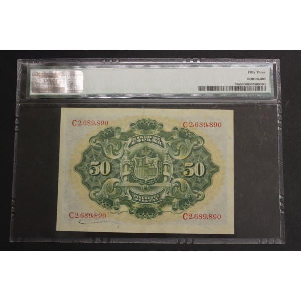 Billete del Banco de España fecha emision 15 de Julio de 1907 Madrid reinando Alfonso XIII de valor 50 pesetas. Pick#58a. Serie C. Banknote Alegorias Justicia.. Encapsulado PMG 53 / About Uncirculated. EBC