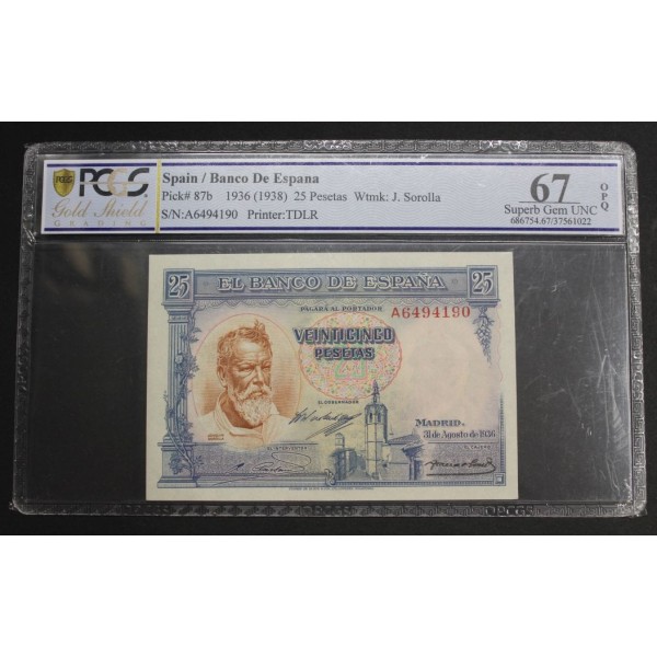 1936- SOROLLA -PCGS 67- OPQ -SERIE A- 25 PESETAS
