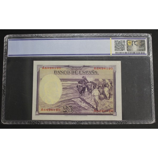 Billete del Banco de España fecha emison 31 de Agosto de 1936 Madrid de valor 25 pesetas. Serie A. Estado Español. Clasificacion PICK#87b. Billete del pintor Joaquin Sorolla. Conservacion Sin Circular. Encapsulada PCGS 67 / OPQ / Superb Gem UNC.