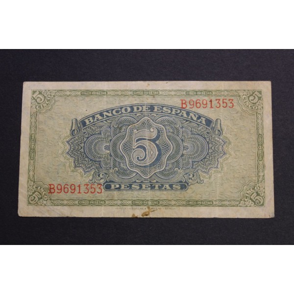 Billete de Banco de España de valor 5 Pesetas fecha 4 de Septiembre de 1940 Madrid Billete serie B.- Estado Español epoca Francico Franco Banknote clasificacion PICK#123a conservacion (MBC) con leve manchita en reverso