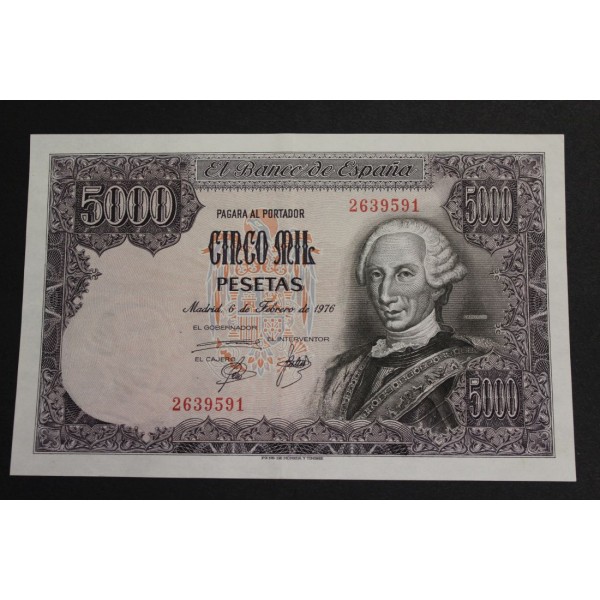 Billete de España fecha 6 de febrero 1976 Banco de España de valor 5000 Pesetas Billete del rey Carlos III Banknote SIN serie. clasificacion Pick#155. conservacion EBC.