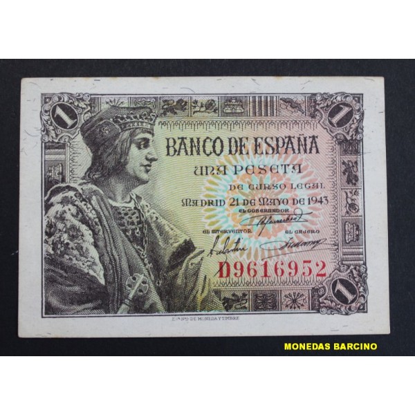 Billete del Banco de España fecha 21 de Mayo de 1943 Madrid Estado Español de valor 1 Pesetas Billete Serie D. del Rey Fernando el Catolico. clasificacion PICK#126a conservacion EBC Sin Doblez Central. Leve manchitas. ver imagen fotografiada.