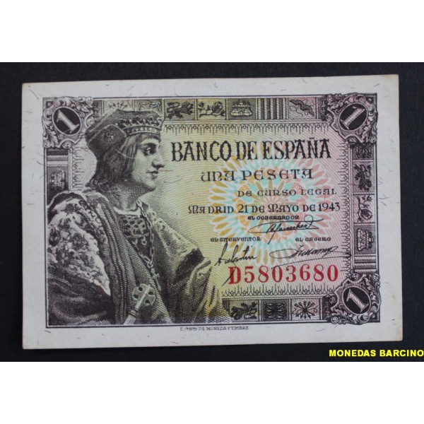 Billete del Banco de España fecha 21 de Mayo de 1943 Madrid Estado Español de valor 1 Pesetas Billete Serie D. del Rey Fernando el Catolico. clasificacion PICK#126a conservacion EBC Sin Doblez Central. ver imagen fotografiada.