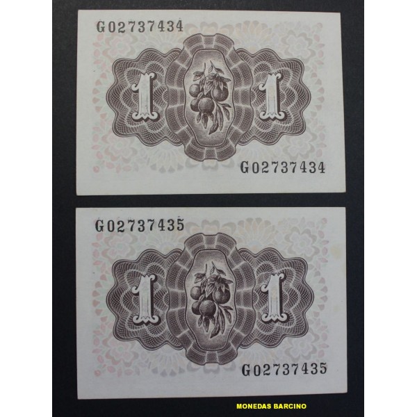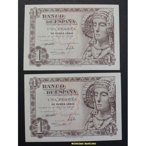 2 Billetes Pareja del Banco de España fecha 19 de Junio de 1948 Madrid Estado Español de valor 1 Pesetas Serie G. Billetes de la Dama de Elche Banknote clasificacion PICK#135a conservacion (SC) ver imagen fotografiada.