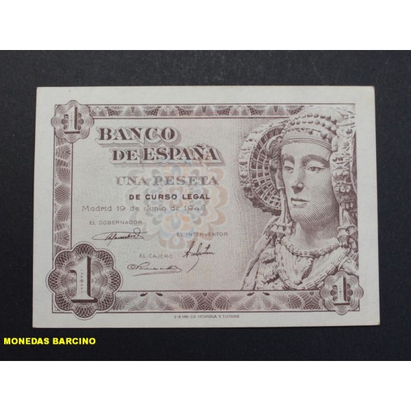 Billete del Banco de España fecha 19 de Junio de 1948 Madrid Estado Español de valor 1 Pesetas Serie I . Billetes de la Dama de Elche Banknote clasificacion PICK#135a conservacion EBC Sin doblez central ver imagen fotografiada.
