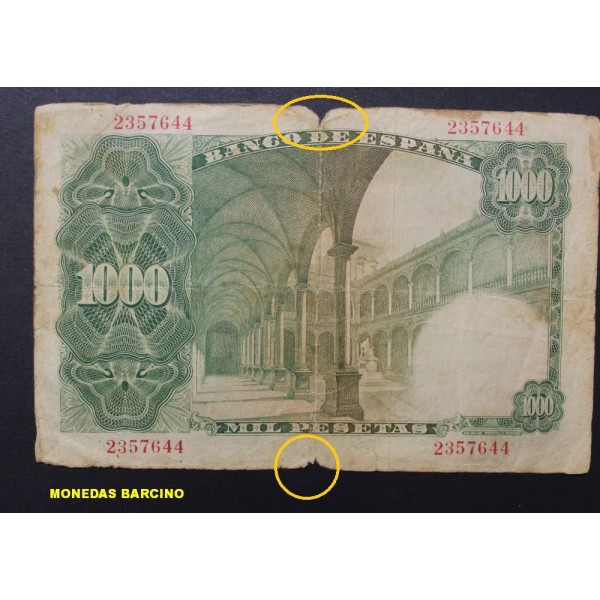 Billete del Banco de España fecha 19 de febrero Madrid 1940 Estado Español de valor 1000 Pesetas Sin Serie. Billete de Luis Vives. Banknote clasificacion PICK#133a. conservacion ( BC- ) roturas en plieges, anotaciones.