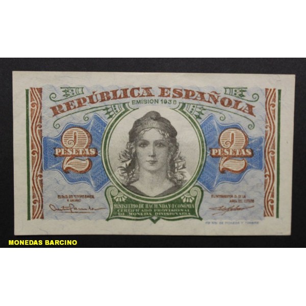 Billete de España Republica Española fecha 1938 de de valor 2 pesetas serie A. Billete del Ministerio de Hacienda. Liberty. Banknote clasificacion Pick#95 conservacion EBC