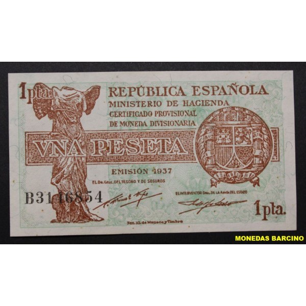 Billete  de España   Republica Española fecha 1937 de de valor  1 pesetas serie B Billete del Ministerio de Hacienda. Nike Samothaki  Banknote  clasificacion Pick#94  conservacion   (SC-)