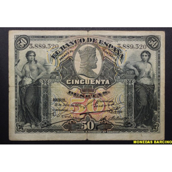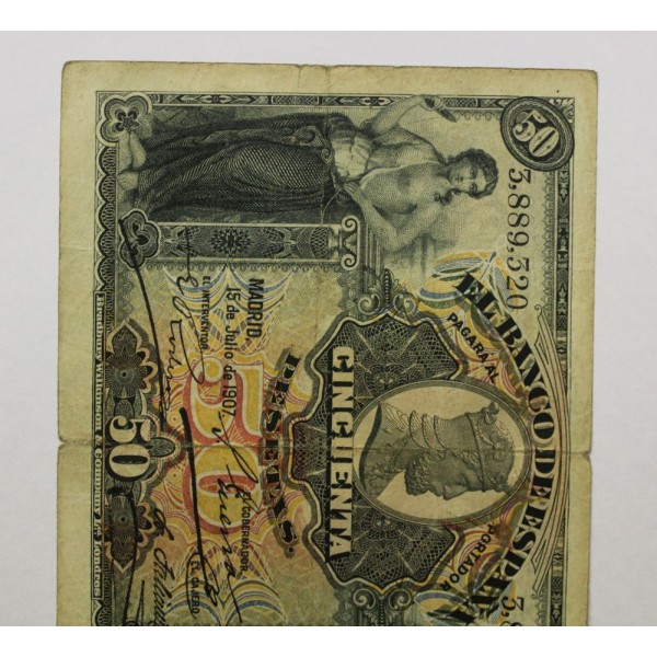 Billete del Banco de España epoca Alfonso XIII. fecha Madrid 15 julio 1907. de valor 50 pesetas Sin Serie . Banknote Alegoria femenina mujer de pie. clasificacion Pick#63a. conservacion (MBC-) puntos de aguja