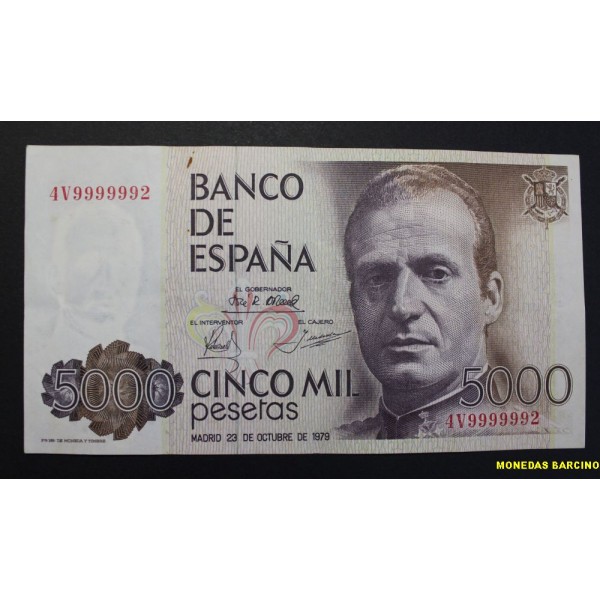 Billete de España fecha madrid 23 de octubre de 1979 Banco de España de valor 5000 Pesetas. Serie 4V . Billete del rey de España Juan Carlos I. clasificacion PICK#160. Numero Curioso 4V9999992 conservacion MBC+