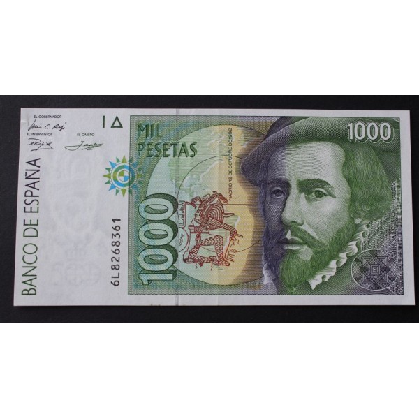 Billete del Banco de España fecha 12 de octubre de 1992 Madrid de valor 1000 pesetas. Serie 6L. Billete del conquitador, capitan y escritor Hernan Cortes . clasificacion Pick#163. conservacion EBC.