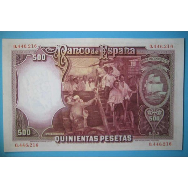 Billete del Banco de España fecha emison 25 de Abril de 1931 Madrid de valor 500 pesetas. Sin Serie . Clasificacion PICK#84. Billete de Juan Sebastian de Elcano. Conservacion EBC