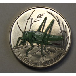 Moneda de Alemania año 2024 Deutschland de valor facial 5 euros conmemorativos de la serie Reino de los Insectos Grillo Verde Grunes Heupferd. Moneda coloreada sin circular,