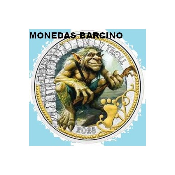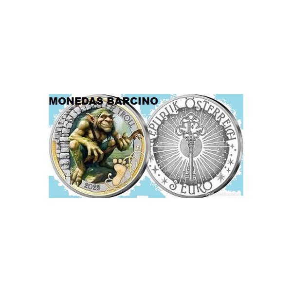 Moneda de Austria año 2026 euros de Osterreich de valor facial 3 euros de color Moneda conmemorativa de El Troll. Serie Criaturas Miticas Fantasticas. Metal cupronikel y color. conservacion sin circular.