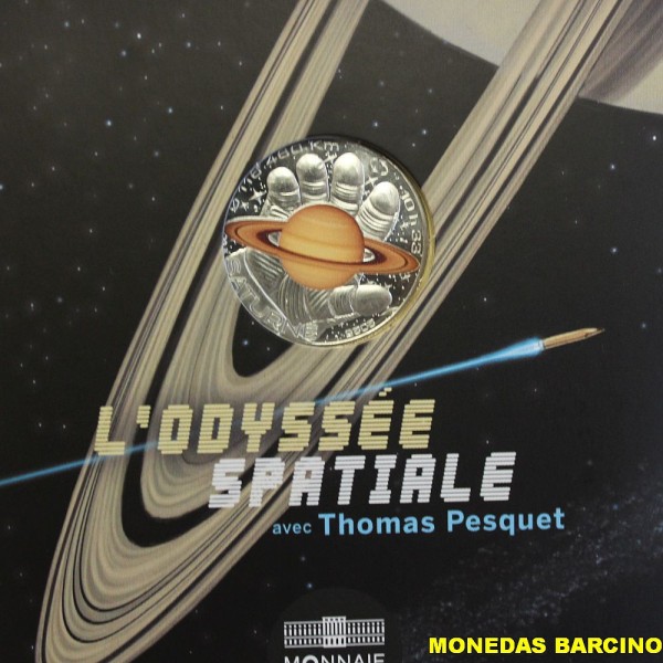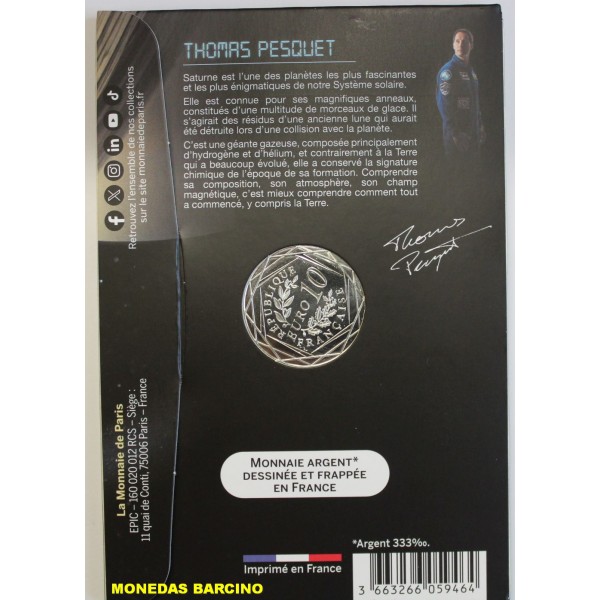 Monedas de Francia de valor facial 10 euros de plata 333 mls. Moneda conmemorativa de la serie Odisea Espacial. dedicada al planeta Saturno. Thomas Pesquet. Monnaie de Paris . Moneda con blister original sin circular