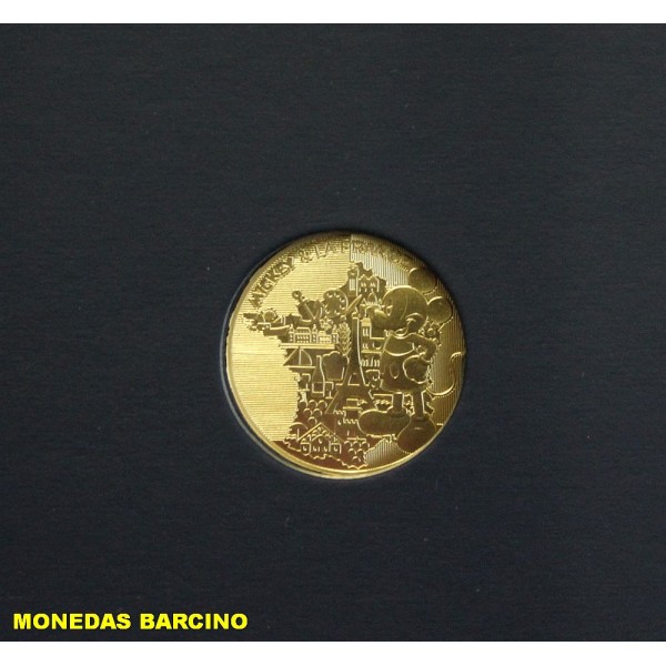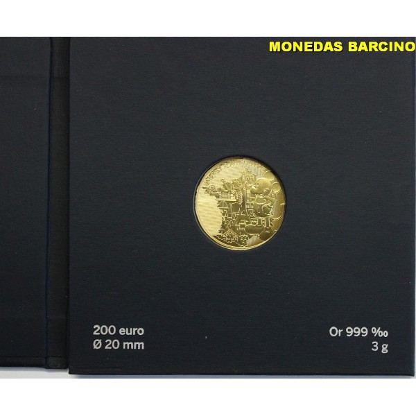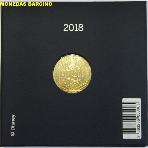 Moneda de Francia año 2018 de la republica Francesa de valor 200 Euros de oro 999 mlis. Moneda conmemorativa dedicada a los 90 años de Mickey Mouse en Francia. moneda sin circular. presentada en su Coincad Oficial.