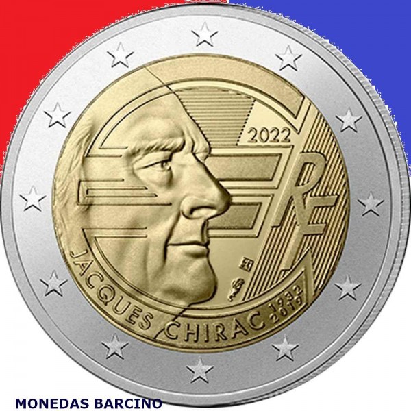Monedas de Francia de valor facial 2 euros Proof Moneda conmemorativa Homenaje al presidente Jacques Chirac aniversario al presidente de la republica francesa entre 1995 a 2007. euros Monnaie de Paris del año 2022 Moneda Proof presentada con capsula estuche y certificado Oficial.