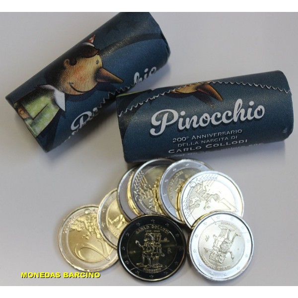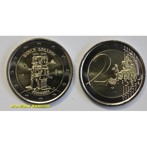 Monedas de Italia año 2025 de valor facial 2 Euros Conmemorativos del 200 Aniversario del nacimiento de Carlo Collodi Pinocho. Monedas Nuevas sin circular directas de cartucho.