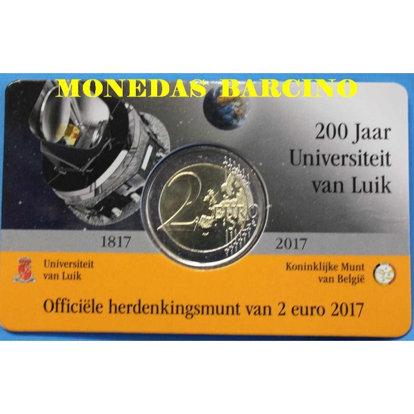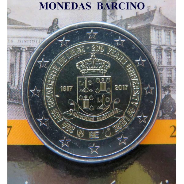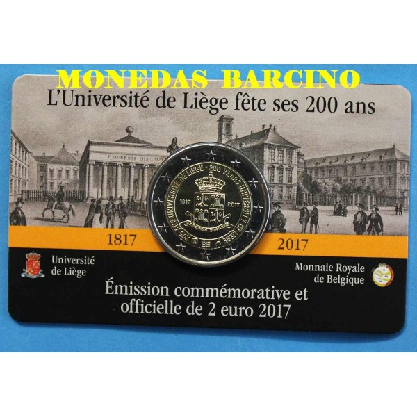 Euros de Europa monedas de Belgica año 2017 de valor facial 2 euros conmemorativos del Aniversario de la Universidad de Liege Fete ses 200 ans. la moneda sin circular en coincard blister original