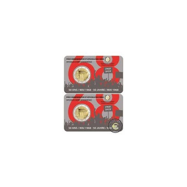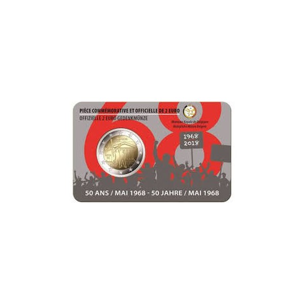 Euros de Europa Moneda de Belgica Belgique de valor 2 euros conmemorativa 50 Años del aniversario de mayo 1968 de Belgica Moneda sin circular en coincard oficial en FRANCES