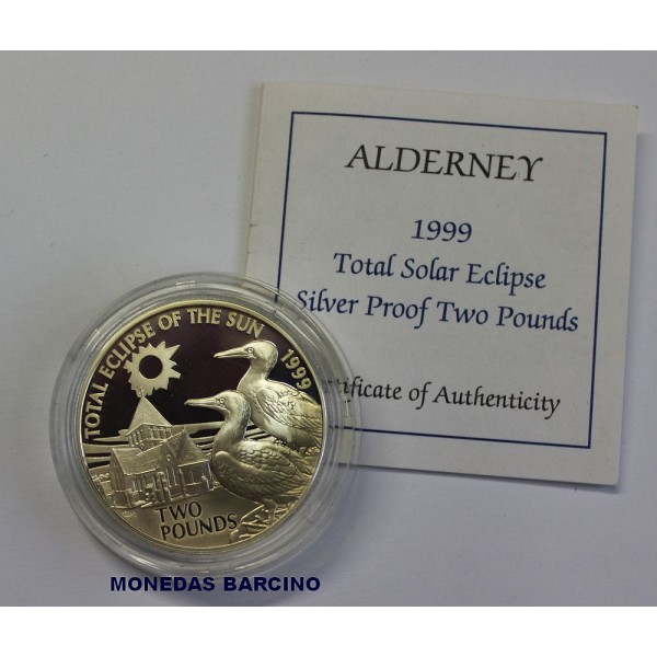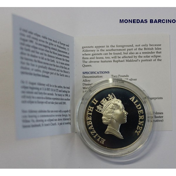 Moneda de Alderney - Guernsey año 1999 de valor two Pounds 2 Libras de plata 925 mls Reina Elizabeth II. Moneda conmemorativa de Total Solar Eclipse .-Silver Proof - The Royal Mint. United Kingdom. calidad Proof. con Capsula y Certificado Oficial. ver imagenes