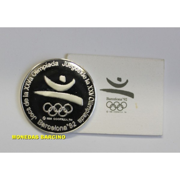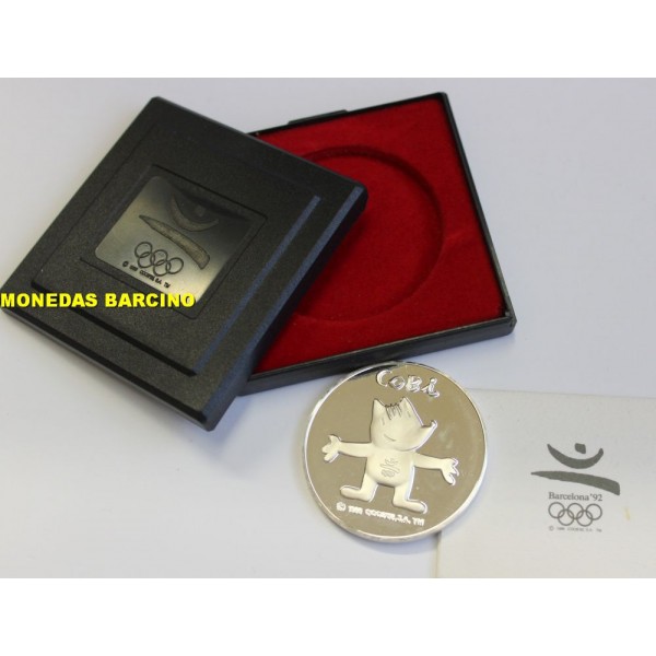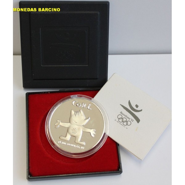 Medalla de Catalunya Cataluña año 1988 de Plata tipo onza Moneda Conmemorativa de Las XXV olimpiadas de Barcelona 1992 mascota de las olimpiadas Cobi. Peso total: 24,95gr. Diámetro: 40mm. calidad. Proof de Plata silver 1000 /1000 mileseimas. Moneda presentada con capsula estuche y certificado.