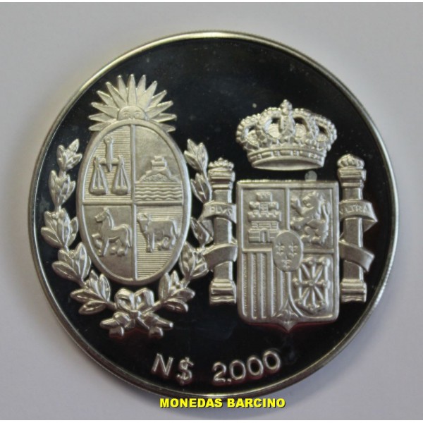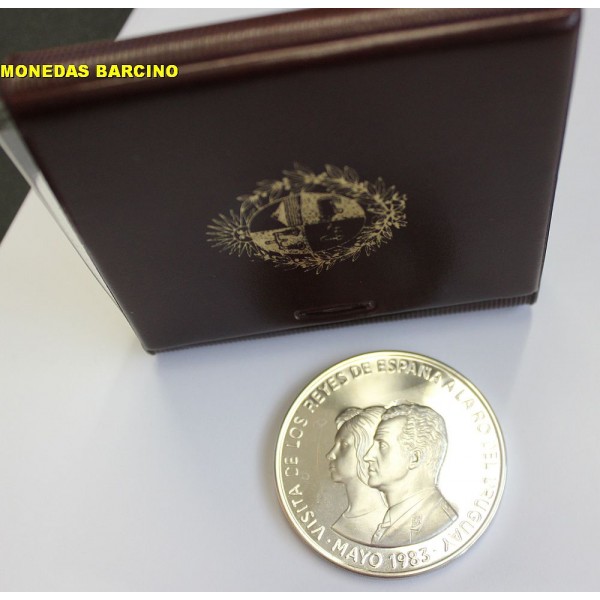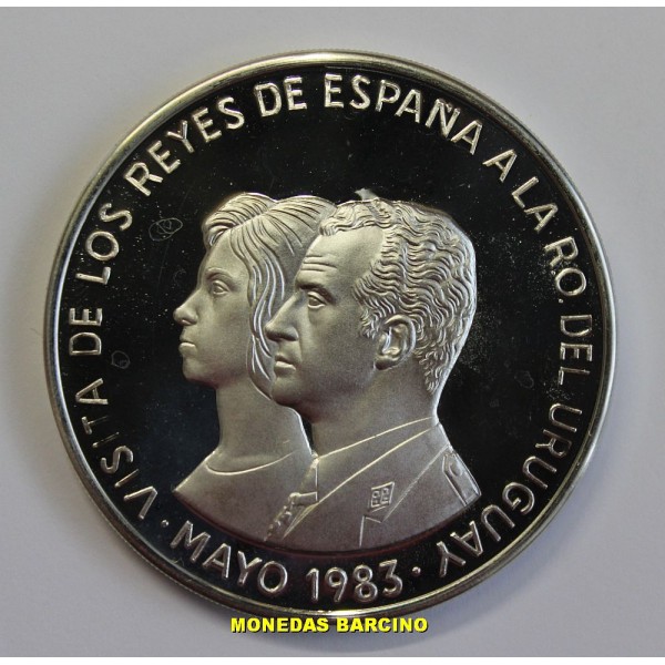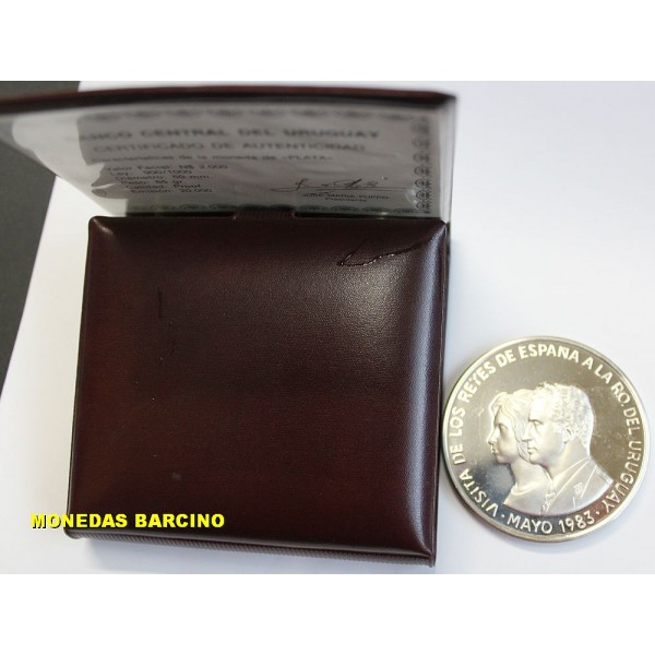 Moneda del Banco Central de Uruguay año 1983 de valor 2000 pesos de plata 900/1000. Moneda conmemorativa de los reyes de España Juan Carlos I y Sofia en su visita a Uruguay. en revero escudo España y Uruguay. calidad Proof La moneda presentada con certificado y carterita.