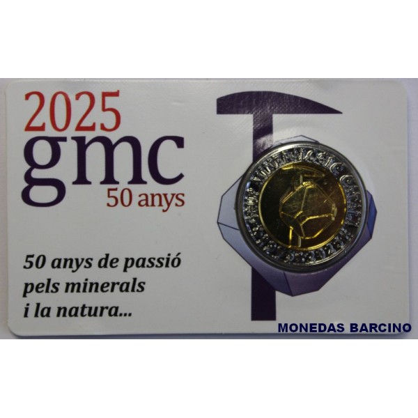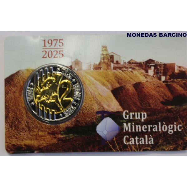 Prueba Numismarica de Catalunya 2025 Cataluña año 2025 de valor 2 Euros conmemorativos del 50 Anys Grup Mineralogic Catalá. 1975 - 2025. moneda sin circular en coincard. Prova Numismatica