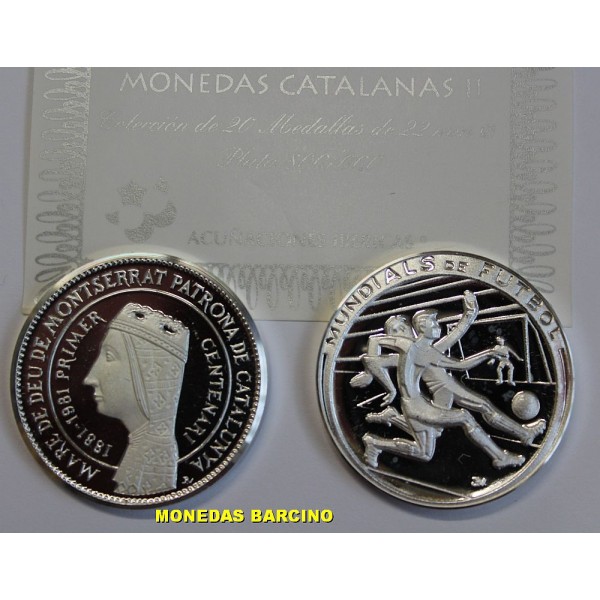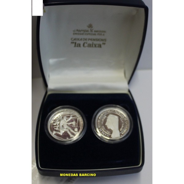 Colccion de 2 Medallas de Catalunya año 1982 Ley plata 800 mls. 2 Medallas conmemorativa del Mundial de Futbol 1982 y de Sant Jordi y la virgen de Montserrat. Emision especial Caixa de pensions La Caixa. calidad proof brillo. Las medallas presentadas con capsula y estuche y certificado.