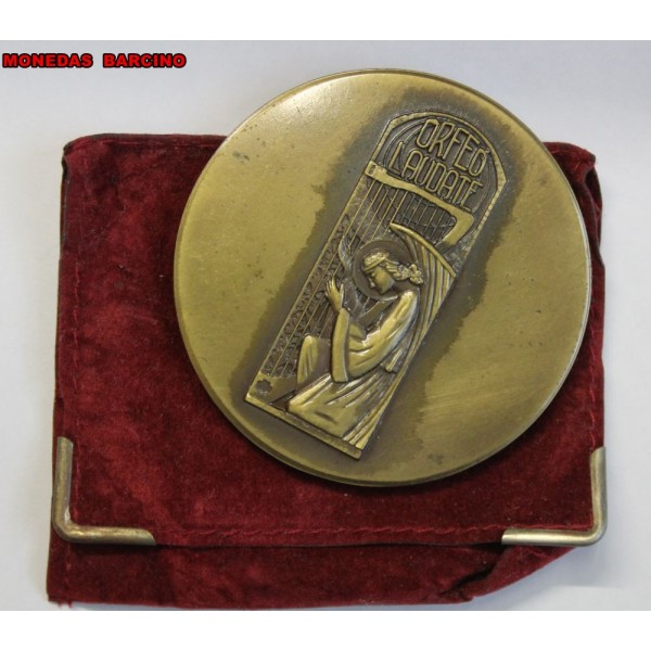 Medalla Conmemorativa del 50 aniversario del Orfeo Laudate 1942 - 1992. Medalla de Barcelona. metal Dorado. Peso 108,71gr. diametro 61 mm. conservacion EBC. Presentada con sobre de terciopelo. Insignias Medallas Barcelona casa Pujol.