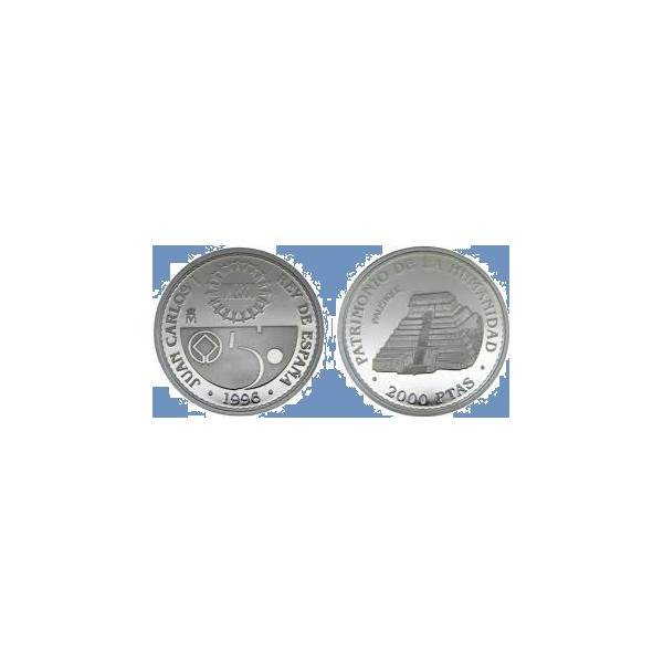 Moneda de España año 1996 rey Juan Carlos I. de valor 2000 pesetas 8 reales de plata. Moneda Conmemorativa del patrimonio Mundial Palenque Mexico. La Moneda con estuche capsula y certificado Oficial Real casa de la Moneda. F.N.M.T fabrica Nacional Moneda y Timbre . calidad Proof