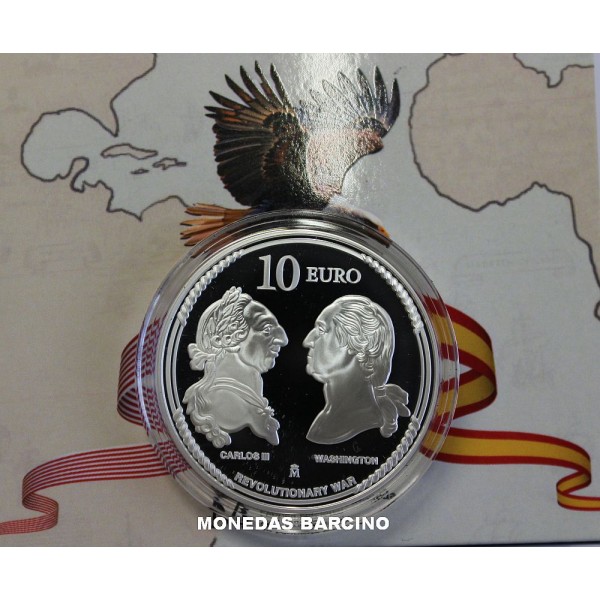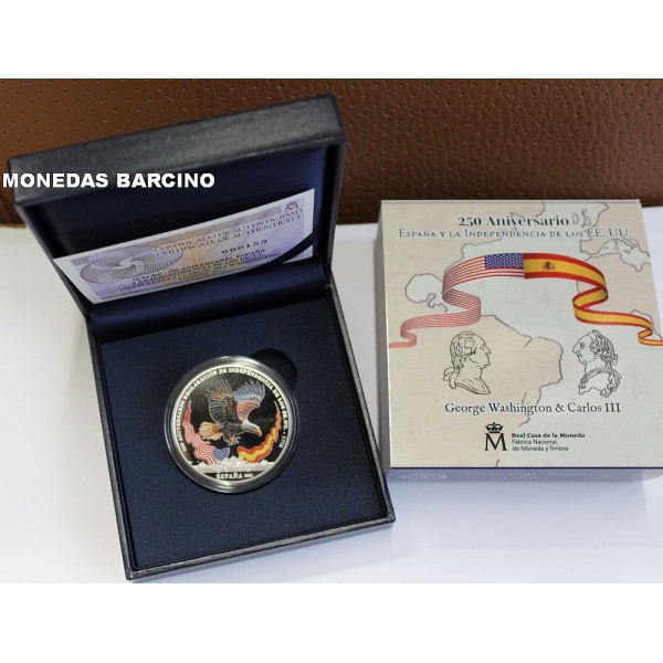 Moneda de España año 2025 rey Felipe VI de valor 10 euros de plata 925 mls. 8 reales silver. Moneda Conmemorativa del 25 aniversario España y la independencia de los Estados Unidos. Aguila Calva.- el rey Carlos III y George Washingron. emision 2025. Rey Felipe VI. La Moneda Coloreada calidad Proof con estuche capsula y certificado Oficial.- Real casa de la Moneda F.N.M.T fabrica Nacional Moneda y Timbre