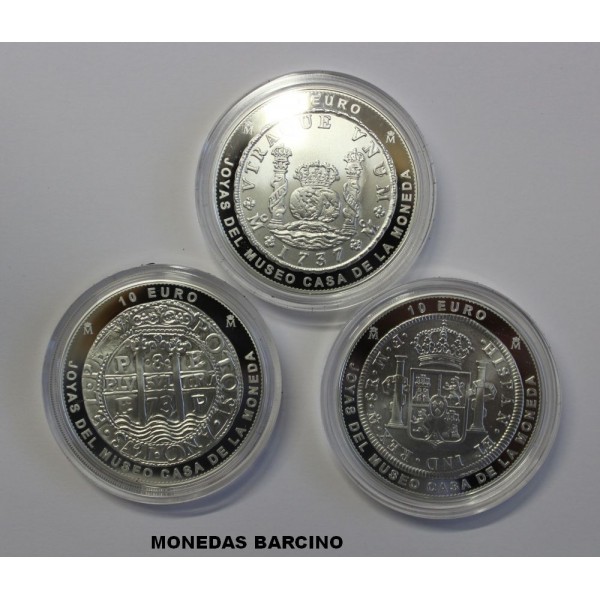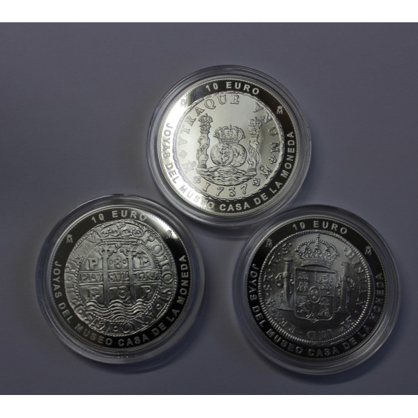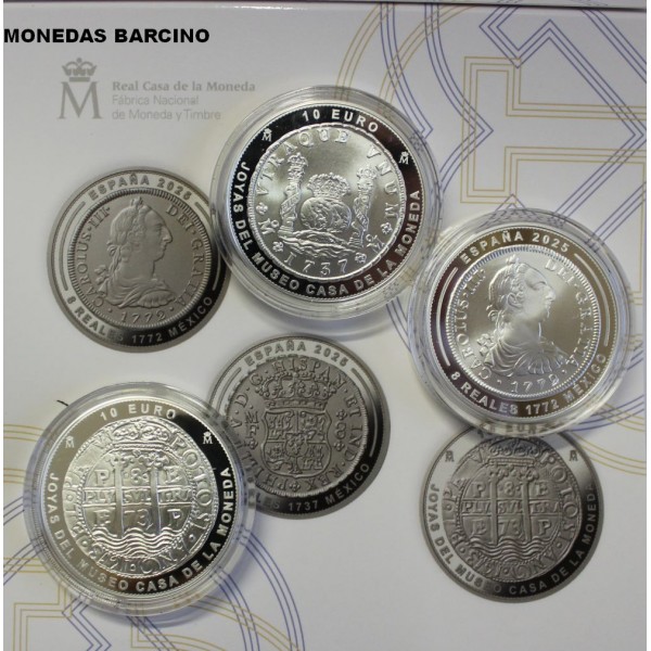 Coleccion de 3 Monedas de España año 2025 rey Felipe VI de valor 10 euros de plata 925 mls. 8 reales silver. Moneda Conmemorativa de la serie II. Joyas del Museo Casa de la Moneda - 1673 Carlos II. ceca Potosi. - 1737 Felipe V. ceca Mexico.- 1772 Carlos III. ceca Mexico emision 2025. Las Monedas calidad Proof con estuche capsula y certificado Oficial.- Real casa de la Moneda F.N.M.T fabrica Nacional Moneda y Timbre