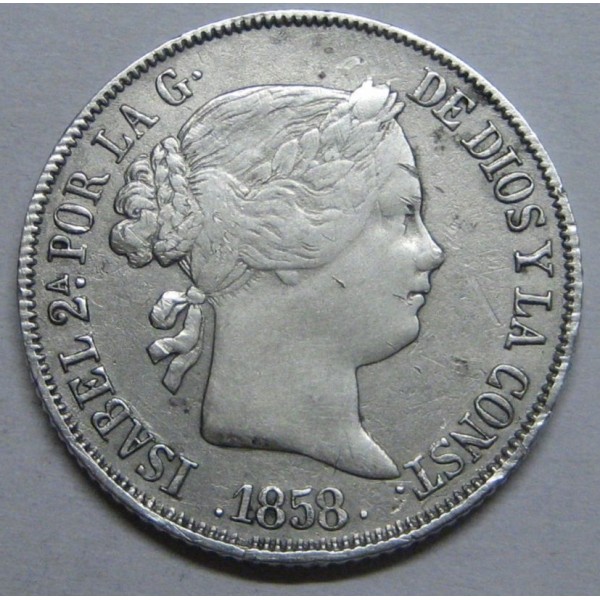 MBC rayitasMoneda de España Reina Isabel II año 1858 valor 4 reales en plata ARG. ceca de Sevilla, estrella de 7 puntas.