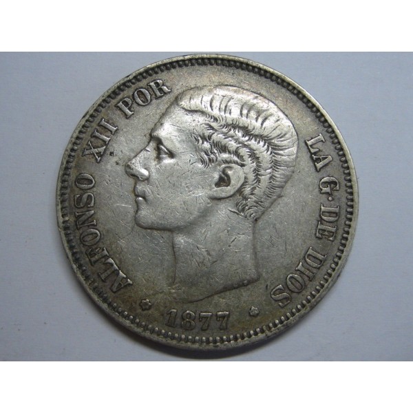 Moneda de España año 1877 . de valor 5 pesetas duro de Plata. rey Alfonso XII .. peso. 24,92gr. diametro 37mm. conservacion moneda con leves golpecitos en canto,. ver imagenes fotografiada