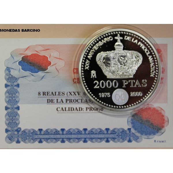 Moneda de España año 2000 de valor facial 2000 pesetas de plata 8 reales Moneda conmemorativa del XXV Aniversario de la proclamacion de su magestad el rey Juan Carlos I España . Ley silver plata 925 milesimas peso 27gr. diametro 40mm. canto Estriado calidad Proof, la moneda con capsula estuche y certificado Oficial de la F.N.M.T. Fabrica Nacional de Moneda y Timbre. La moneda en perfecto estado y estuche , la caratula de carton puede tener alguna pequeña imperfeccion por almacenamiento