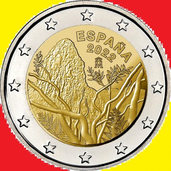 Moneda de España año 2022 de valor facial 2 Euros Proof Moneda Conmemorativa del Parque Nacional de Garajonay Patrimonio Universal de la Unesco en la moneda se puede ver , Roque de Agando y un detalle del bosque Laurisilva, calidad Proof en blister Oficial F.N.M.T.