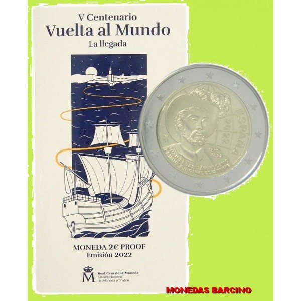 Monedas de España año 2022 de valor facial 2 Euros Proof. Euros Conmemorativos del V centenario de la primera Vuelta al mundo 1519 - 1522 Juan Sabastian Elcano. Calidad Proof. Presentada en blister Oficial. F.N.M.T.
