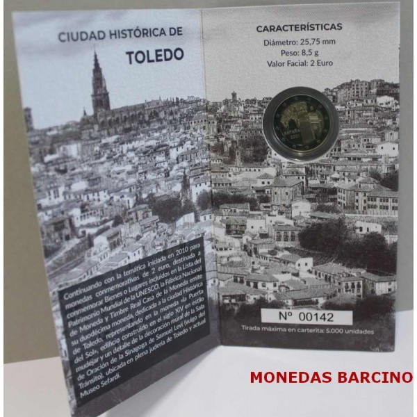 Monedas de ESPAÑA año 2021 de valor facial 2 Euros Proof . Euros Conmemorativos de La ciudad Historica de TOLEDO .Puerta del Sol y la Sinagoga del Tránsito. Monedas calidad Proof con capsula y Coincard oficial numerado de F.N.M.T . Euros de Europa