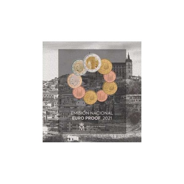 Coleccion de 9 monedas de España año 2021 valor en Euros en calidad Proof Monedas Euro set con capsula en Estuche Oficial Rey Felipe VI Valores 1 centimos - 2 Centimos- 5 Centimos - 10 centimos - 20 Centimos - 50 centimos + 1 euro - 2 euros + 1 moneda de 2 euros conmemorativos de la ciudad de Toledo - 9 monedas con capsula y estuche oficial con certificado de la FABRICA NACIONAL DE MONEDA Y TIMBRE 2022