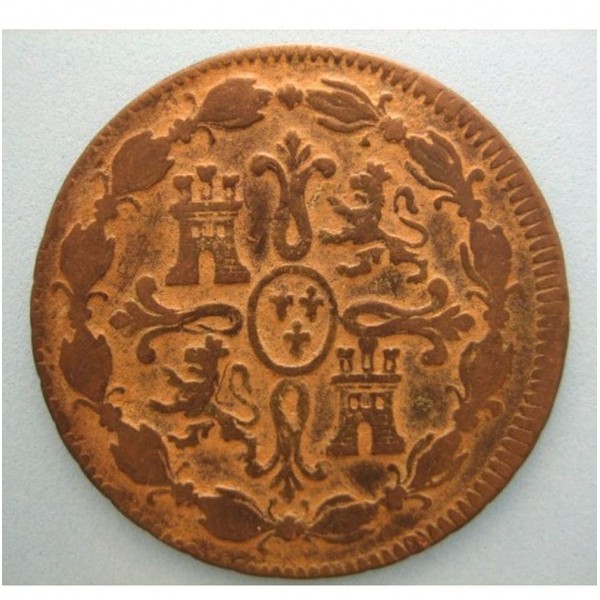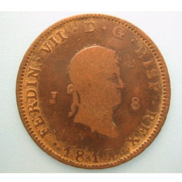 Moneda de España año 1817 ceca Jubia de valor 8 maravedis de cobre del rey Fernando VII . Ley cobre . Peso 8,73 gr. clasificacion CL:15501 conservacion BC+/MBC ver imagenes fotografiadas