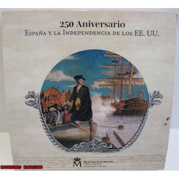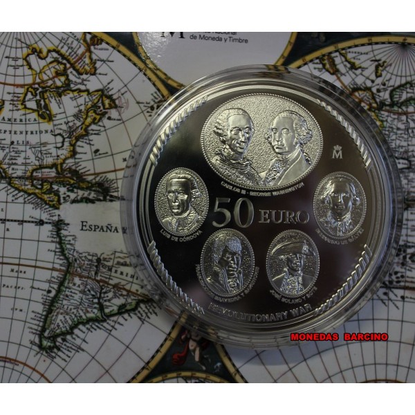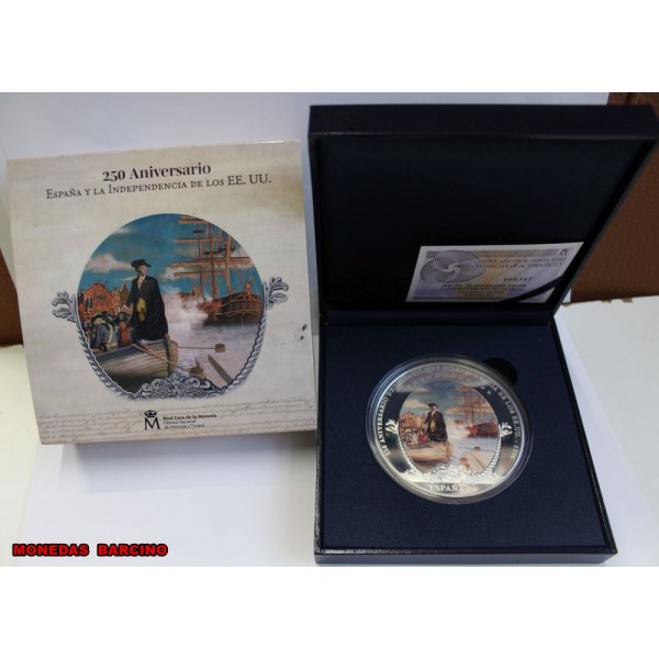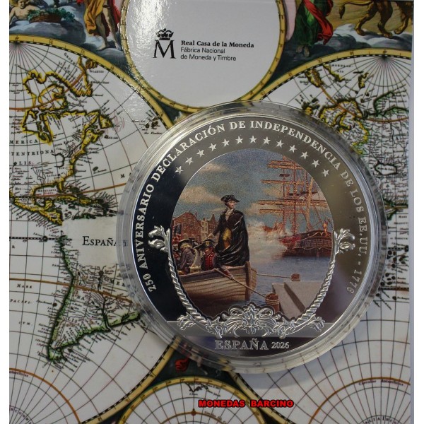 Moneda de España año 2026   rey Felipe VI de valor  50  euros  de plata 925 mls 5 Onzas    Moneda Conmemorativa  del 250 aniversario España y la independencia de los Estados Unidos.  La Moneda Coloreada Proof con estuche capsula y certificado Oficial. Real casa de la Moneda. F.N.M.T  fabrica Nacional Moneda y Timbre