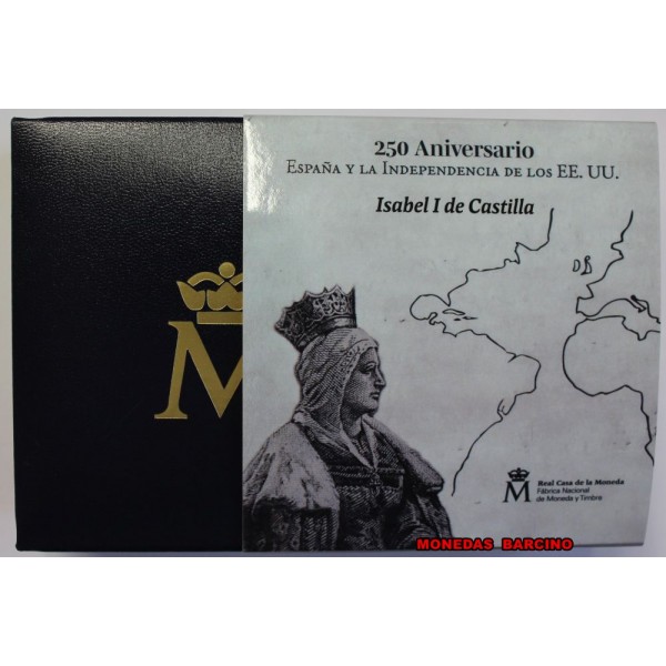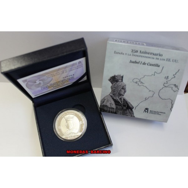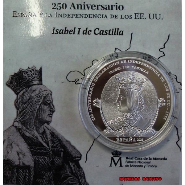 Moneda de España año 2026   rey Felipe VI de valor  10  euros  de plata 925 mls.  8 reales silver.   Moneda Conmemorativa  de la serie  250 aniversario de la Independencia de Estados UnidosMoneda de la Reina Isabel I de Castilla.  en el reverso Carlos III & G. Washington.  La Moneda  Proof con estuche capsula y certificado Oficial.- Real casa de la Moneda. F.N.M.T  fabrica Nacional Moneda y Timbre