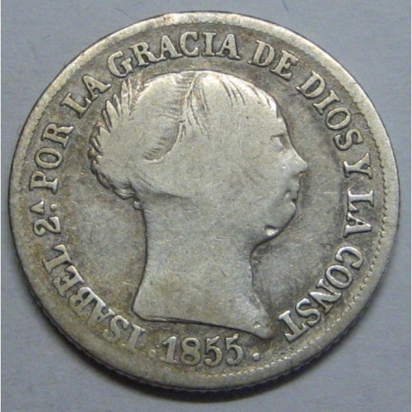 Moneda de España  Reina Isabel II año 1855 valor 2 reales en plata ARG. ceca de Barcelona, estrella de 8 puntas.