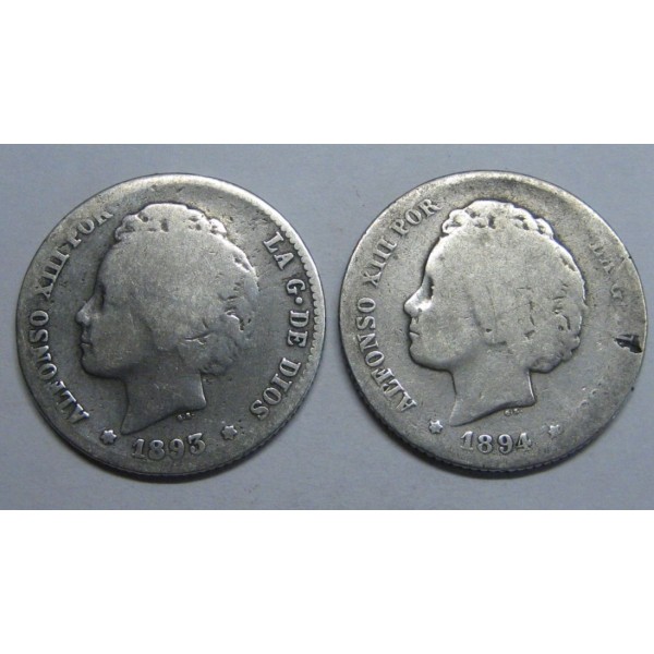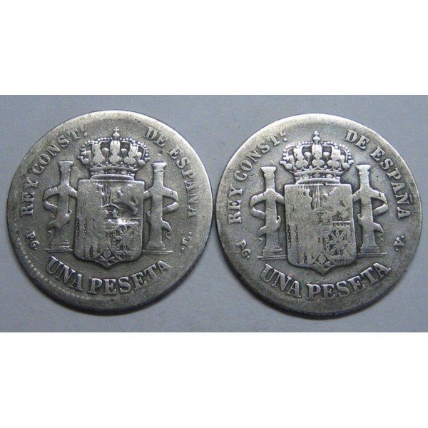 Moneda de España Rey Alfonso XIII. ceca Madrid de valor 1 una peseta de Plata . año 1893 y 1894 lote 2 piezas imagen original fotografiada