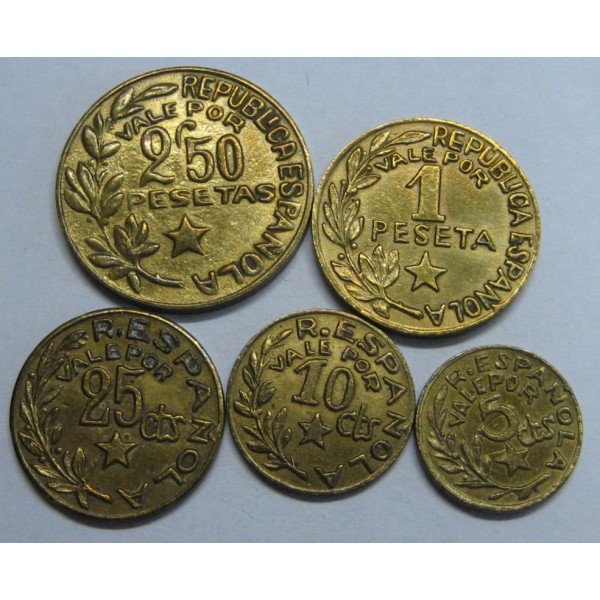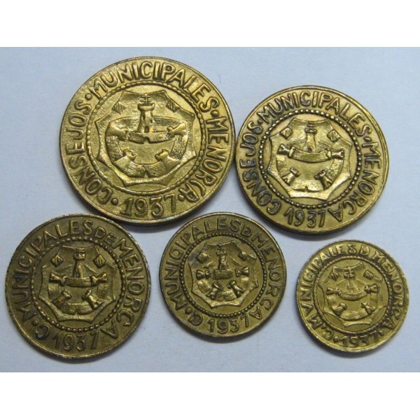Coleccion completa de 5 monedas de España de La guerra civil Española.y Segunda republica de españa Monedas del consejos municipales de Menorca año 1937.de Valores 5 centimos . - 10 centimos. y 25 Centimos y 1 peseta y 2,50 pesetas de España de la guerra civil. española. conservacion MBC+ / EBC . imagen original fotografiada