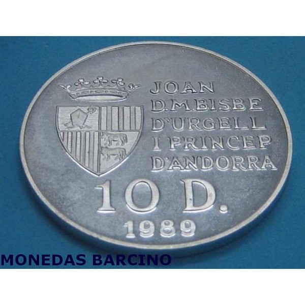 Moneda del Principado de Andorra del año 1989 ANDORRA de 10 DINERS Moneda Conmemorativa del campeonato Mundial Futbol Italia 1990 calidad Proof la moneda de la imagen fotografiada